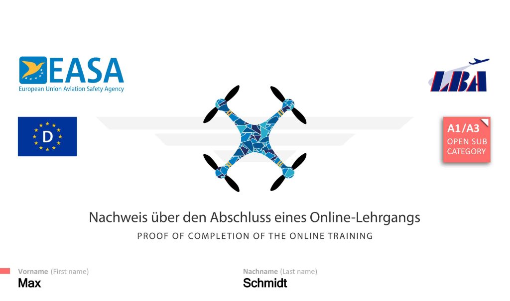 Alle Drohnen, die eine größere Startmasse von 250 Gramm besitzen, können nur von Piloten geflogen werden, welche den EU Kenntnisnachweis A1 besitzen.